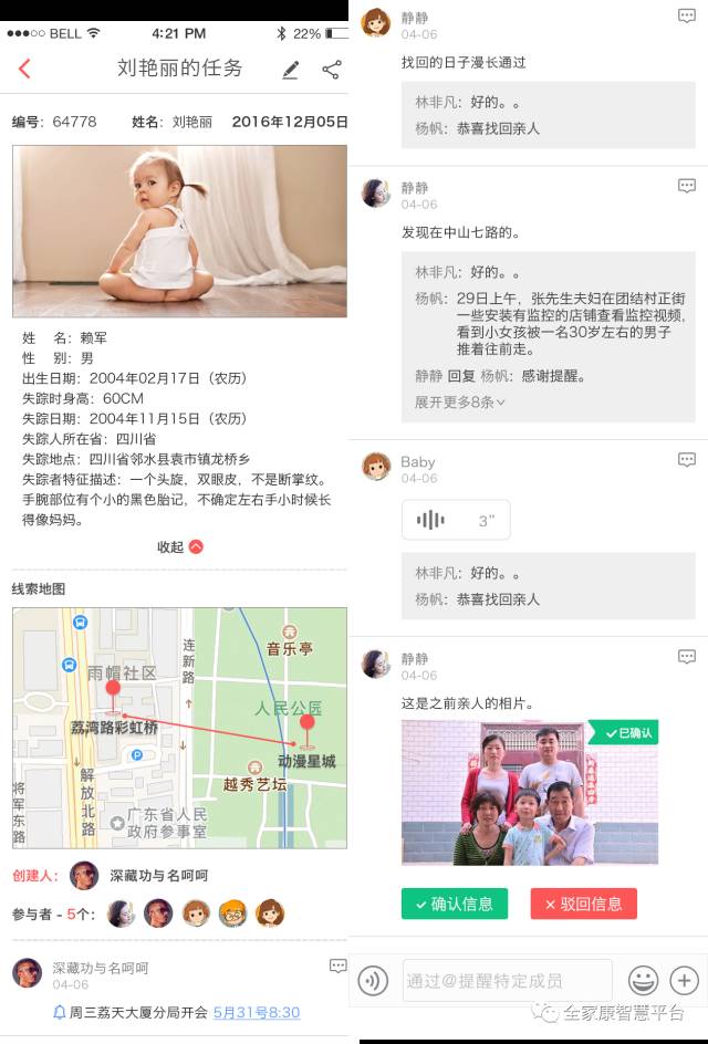 做真正实用、好用,各方都愿意用的APP。一是家长愿意用,能帮家长迅速发布失散孩子的消息;二是民警愿意用,能帮民警实时获得信息、甄别信息、管控信息,快速在APP“入口”调动有效行政资源参与行动;三是义工等社会资源愿意用,在APP“出口”能快速聚合社会资源参与救助。实用、有效、便捷的“全家康防拐打拐APP子系统”将在失踪事件发生后快速布下“天网”。